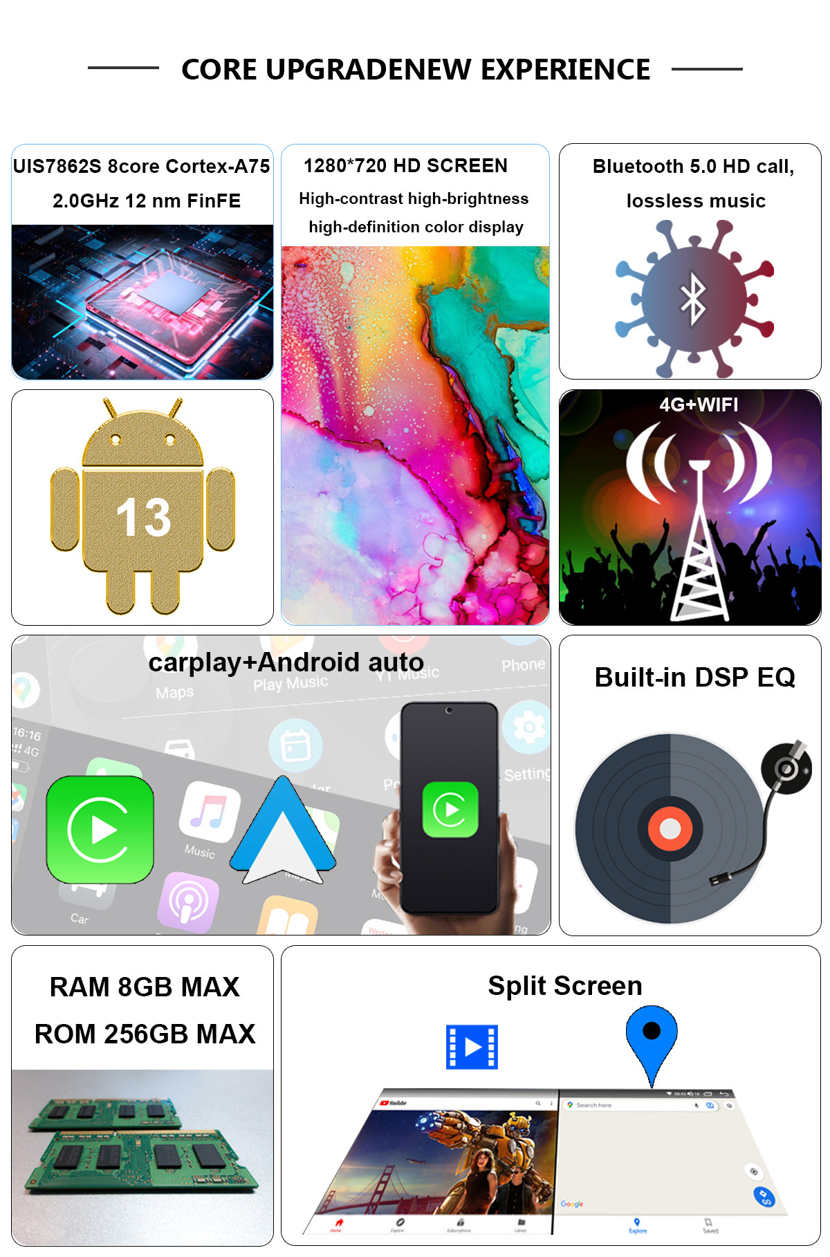 Applicable to JMEV Yi 2023-2025 automotive Android navigation, automotive multimedia radio, 1280 * 720 qled screen, UIS7862S 8-core 2.0GHz processor Supports up to 8GB ram and 256GB ROM